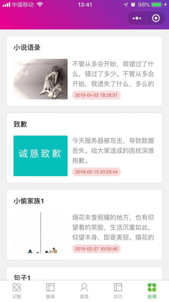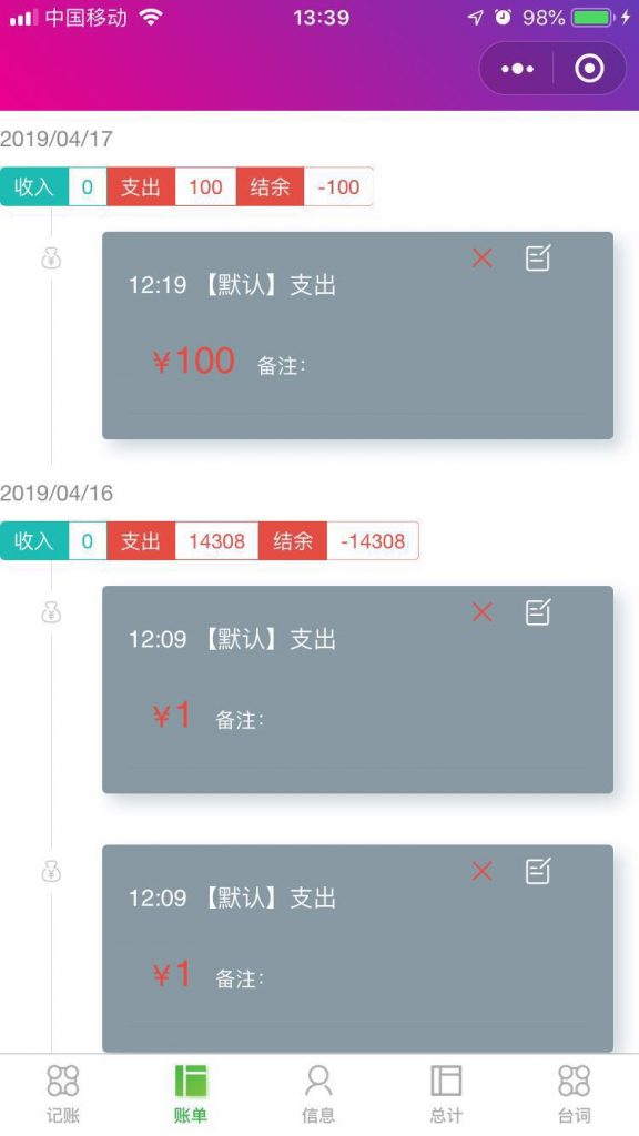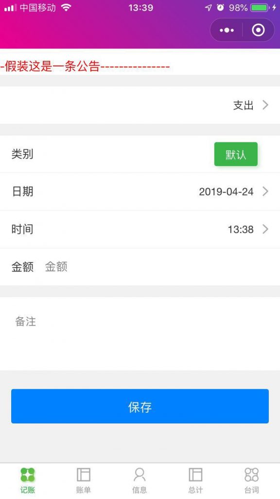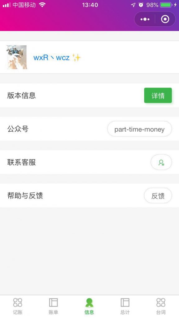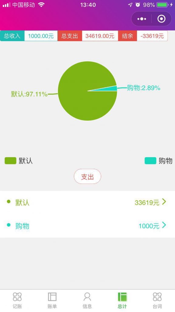 微记账丶 微记账:一款记录日常消费的记账小程序,无需下载,打开微信搜一搜 “微记账丶”或微信扫描以下二维码。 项目基于ColorUI,一款Css类的UI组件库,GitHub地址 微记账丶1.1.12019年4月28日 微记账丶1.0.92019年4月26日